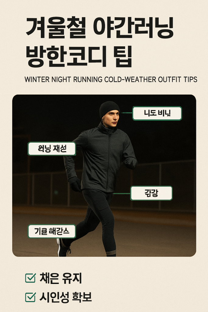 - 겨울 야간러닝에서는 반사 소재와 라이트를 포함한 “보이는 코디”가 필수입니다.