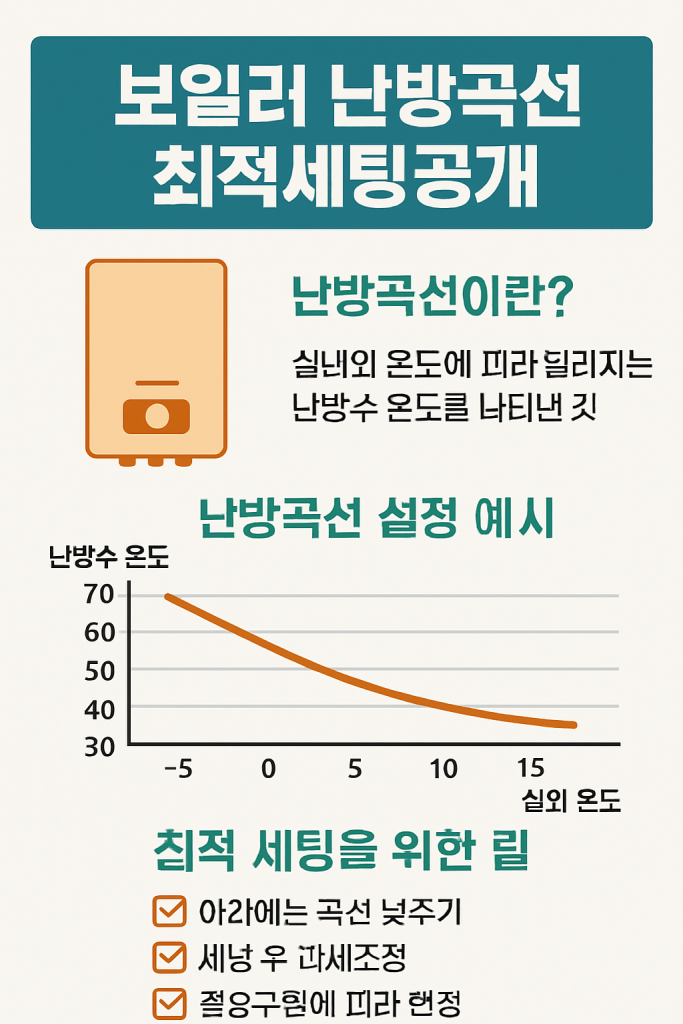 겨울만 되면 실내는 썰렁한데 난방비 고지서는 뜨겁게 나와 답답할 때가 많습니다. 온도만 올리면 따뜻해지지만 가스요금이 무섭고, 아낀다고 낮추면 발만 시린 반쪽짜리 난방이 되기 쉽습니다. 이 글에서는 온도 버튼을 감으로 누르지 않고, 보일러 난방곡선 최적세팅공개라는 개념으로 우리 집에 맞는 난방 그래프를 설계하는 방법을 단계별로 정리합니다. 난방곡선 원리와 주거 형태별 기준값, 실전 세팅 루틴, 자주 생기는 문제 해결법까지 모두 담았으니, 끝까지 읽으면 이번 겨울에는 “난방은 편하게, 요금은 덜 나오게”라는 현실적인 목표에 한층 가까워질 것입니다.